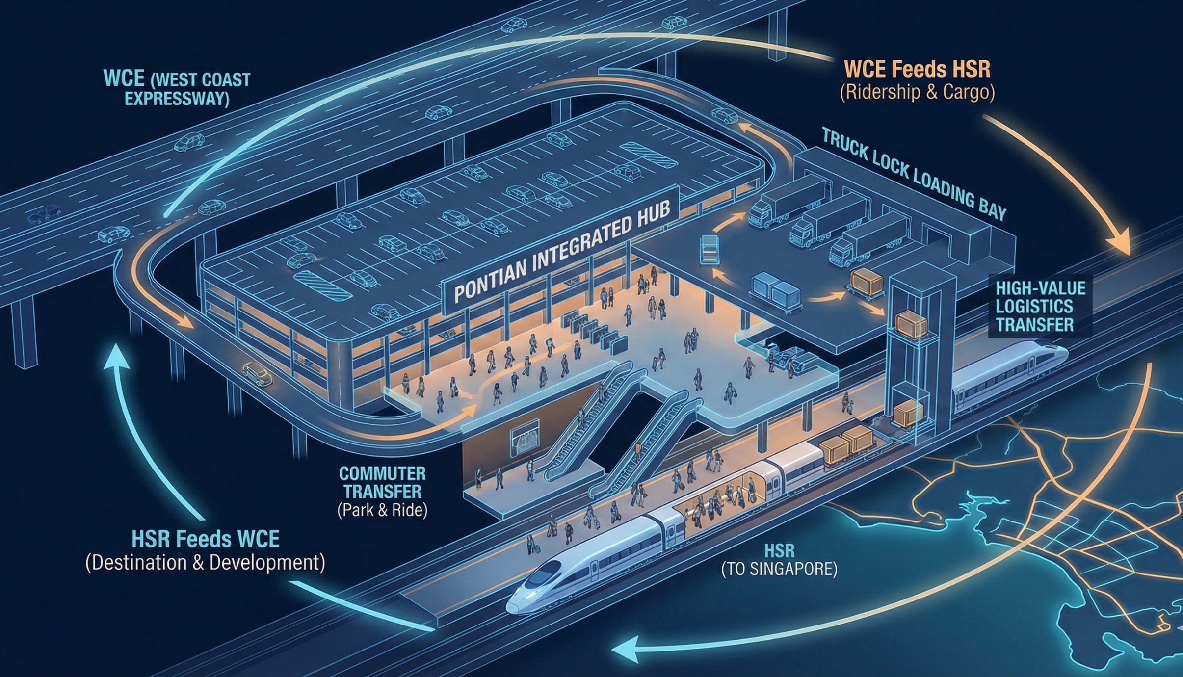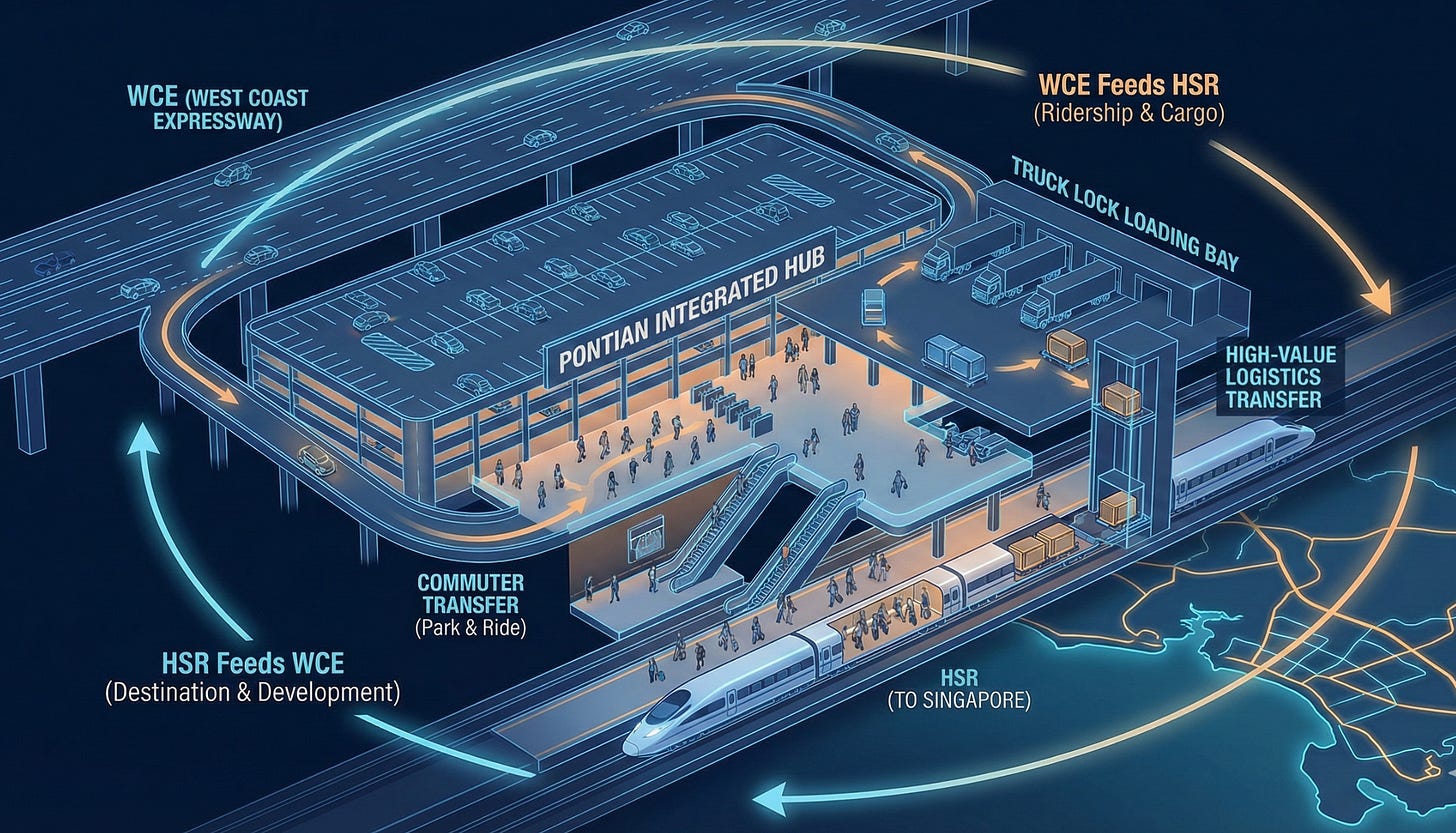 Every HSR station becomes a Highway Interchange Hub. Imagine a “Pontian Integrated Hub.” It isn’t just a train platform. It sits directly off the WCE exit ramp.